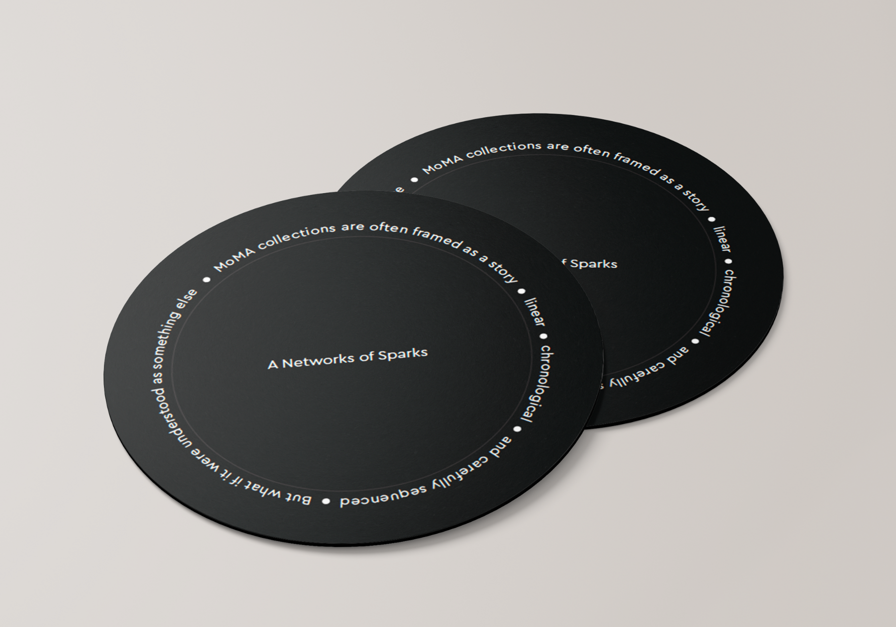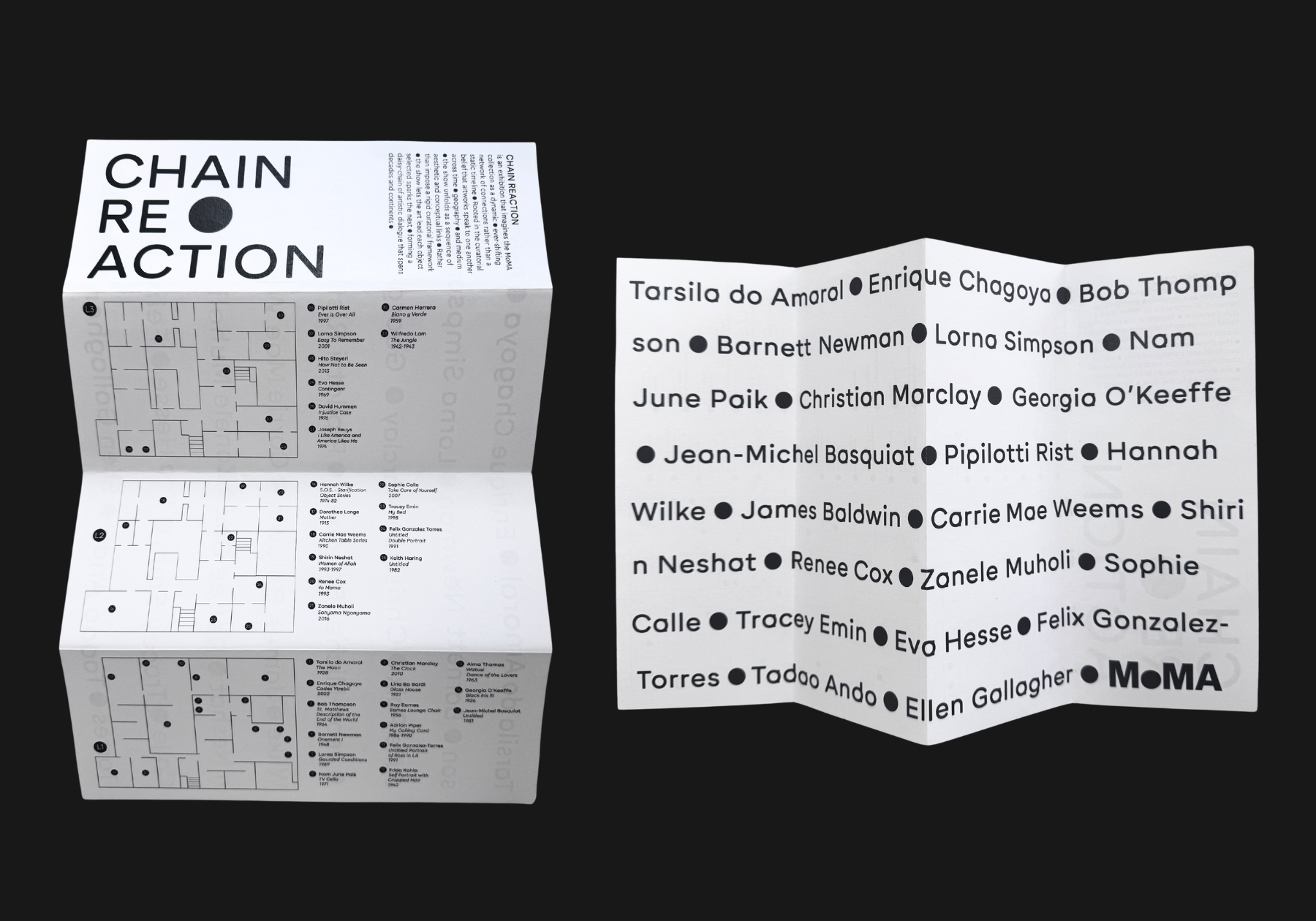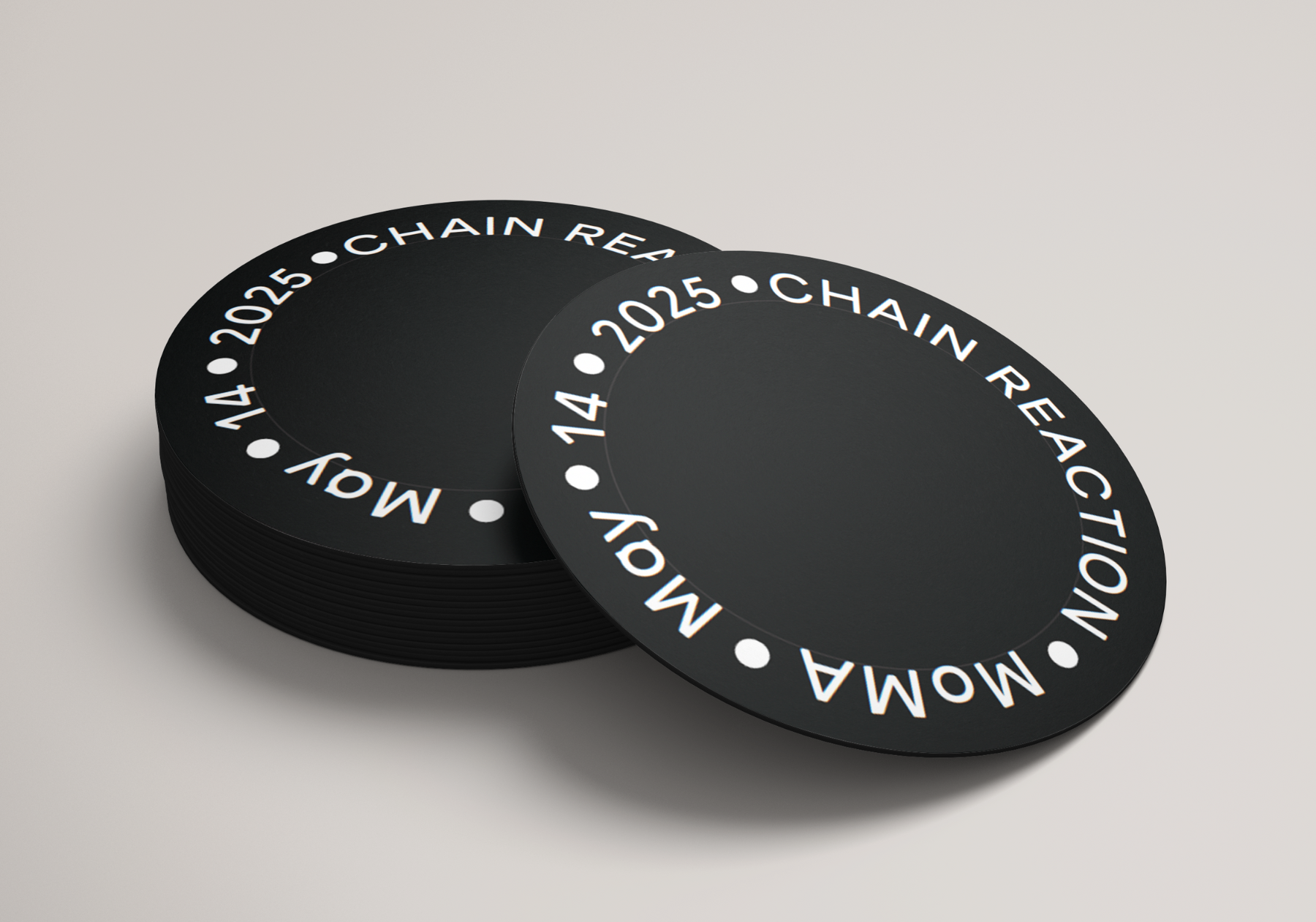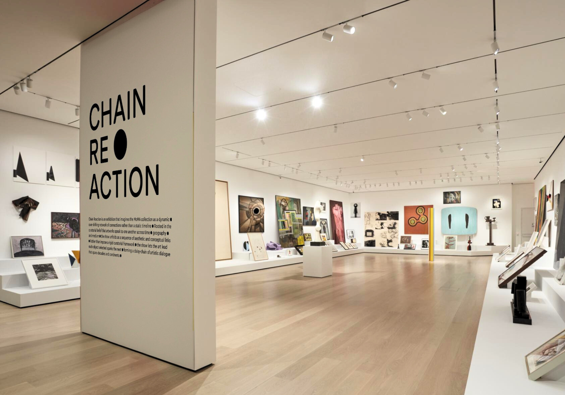 Chain Reaction is an exhibition concept for MoMA that explores how one artwork sparks another. Visually making connection to a Newton’s Cradle and used it as a direct design reference. The design uses two typefaces built from perfect circles to reflect that sense of connection and movement. A single black dot became the main visual element and even replaced traditional punctuation, symbolizing the moment where ideas meet and energy transfers. The result is a clean, rhythmic identity that captures how art continuously inspires what comes next.
