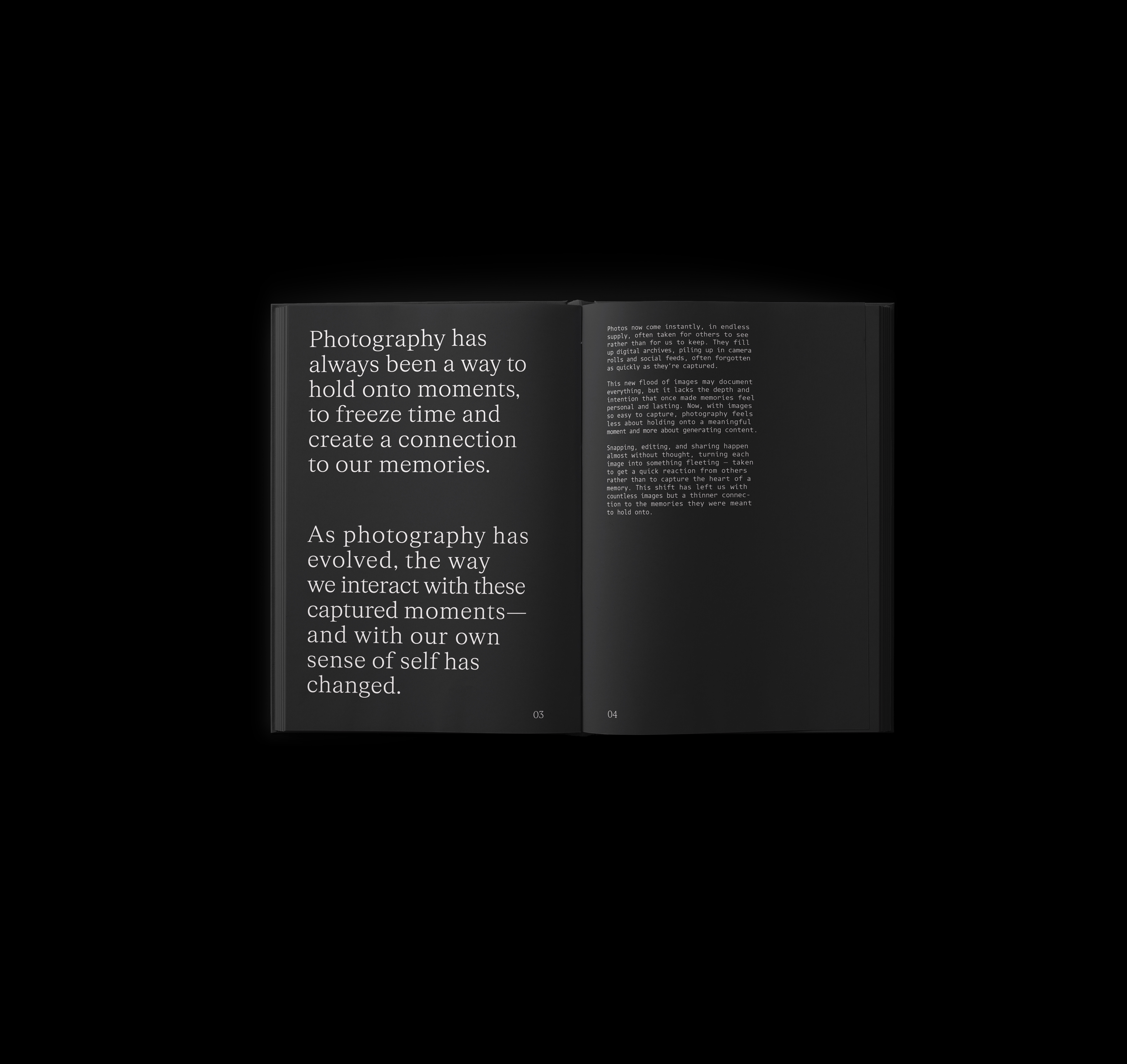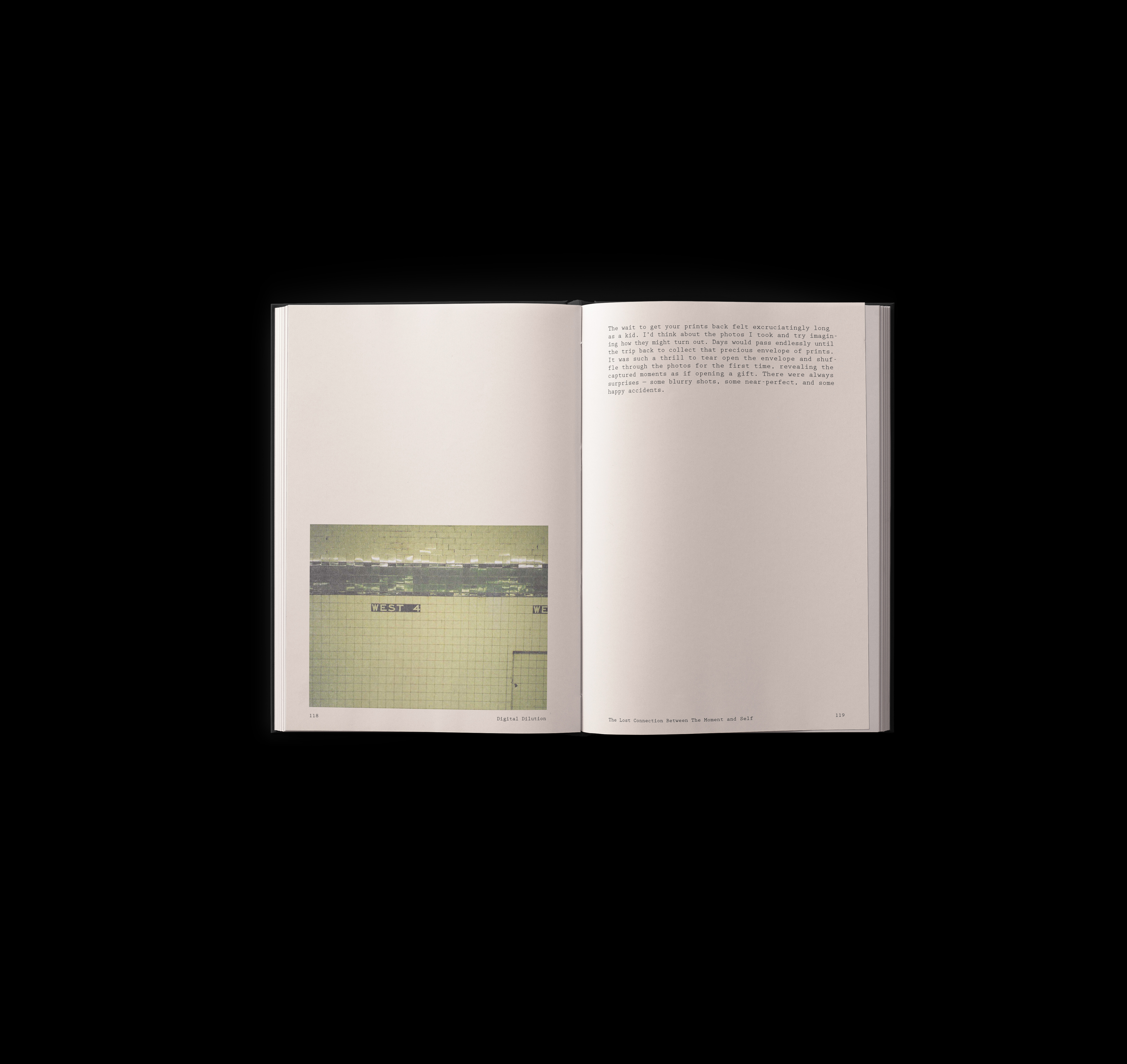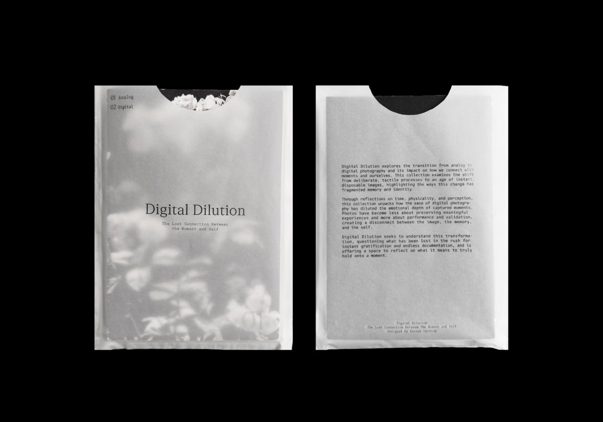 Digital Dilution explores how the transition from analog to digital media has transformed the way we engage with time, memory, and identity. Through imagery and text, the collection examines how the ease and speed of digital technology has distanced us from fully experiencing the moment. It reflects on the emotional and personal disconnection that has emerged in the shift to a more fragmented, fleeting digital culture.