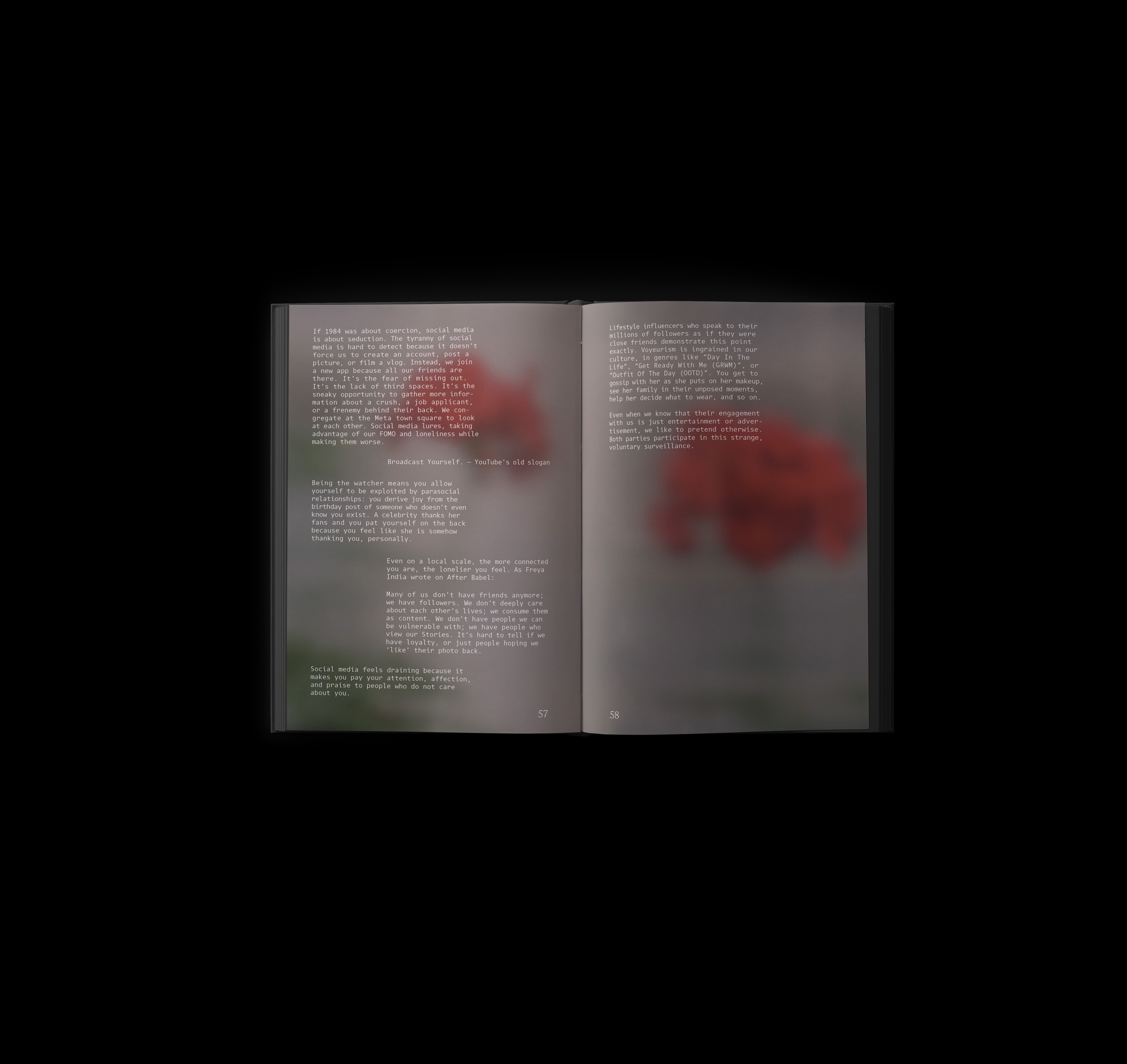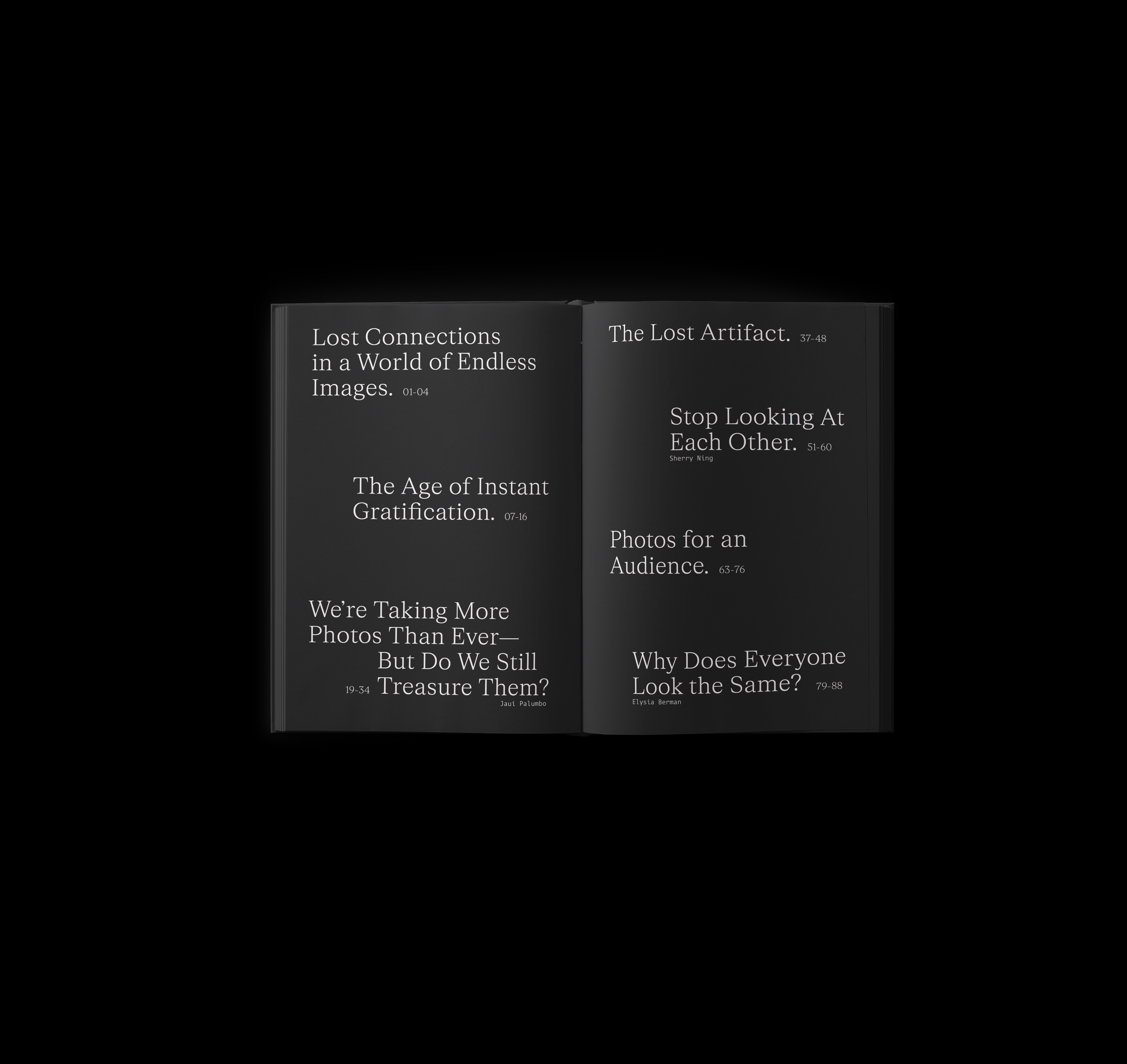 A three-part series exploring the intensity of being a woman. The jumper-ring binding and photo treatment create a subtle discomfort to draw viewers into the narrative. Each section includes a written piece by women reflecting their relationship to the topic.
