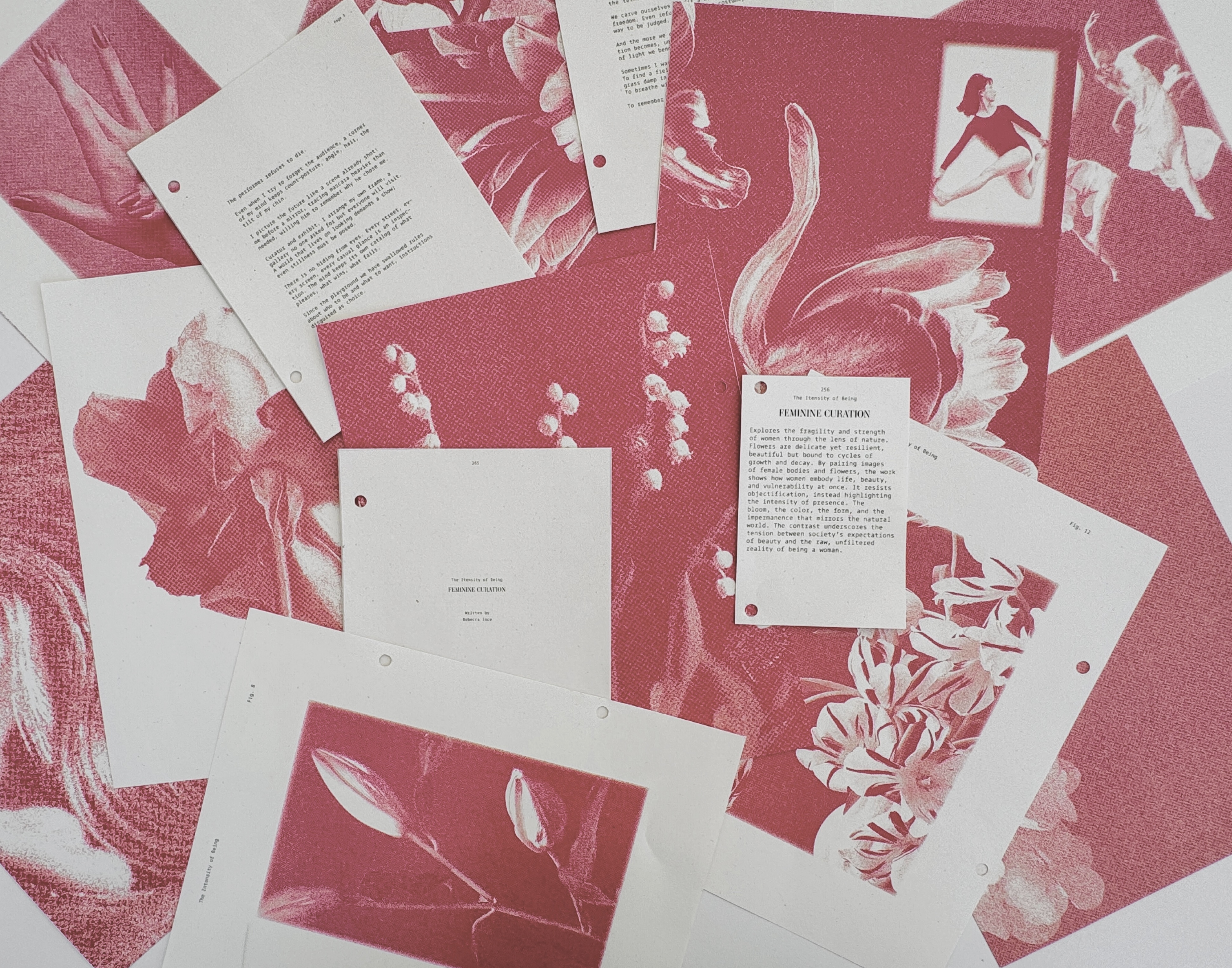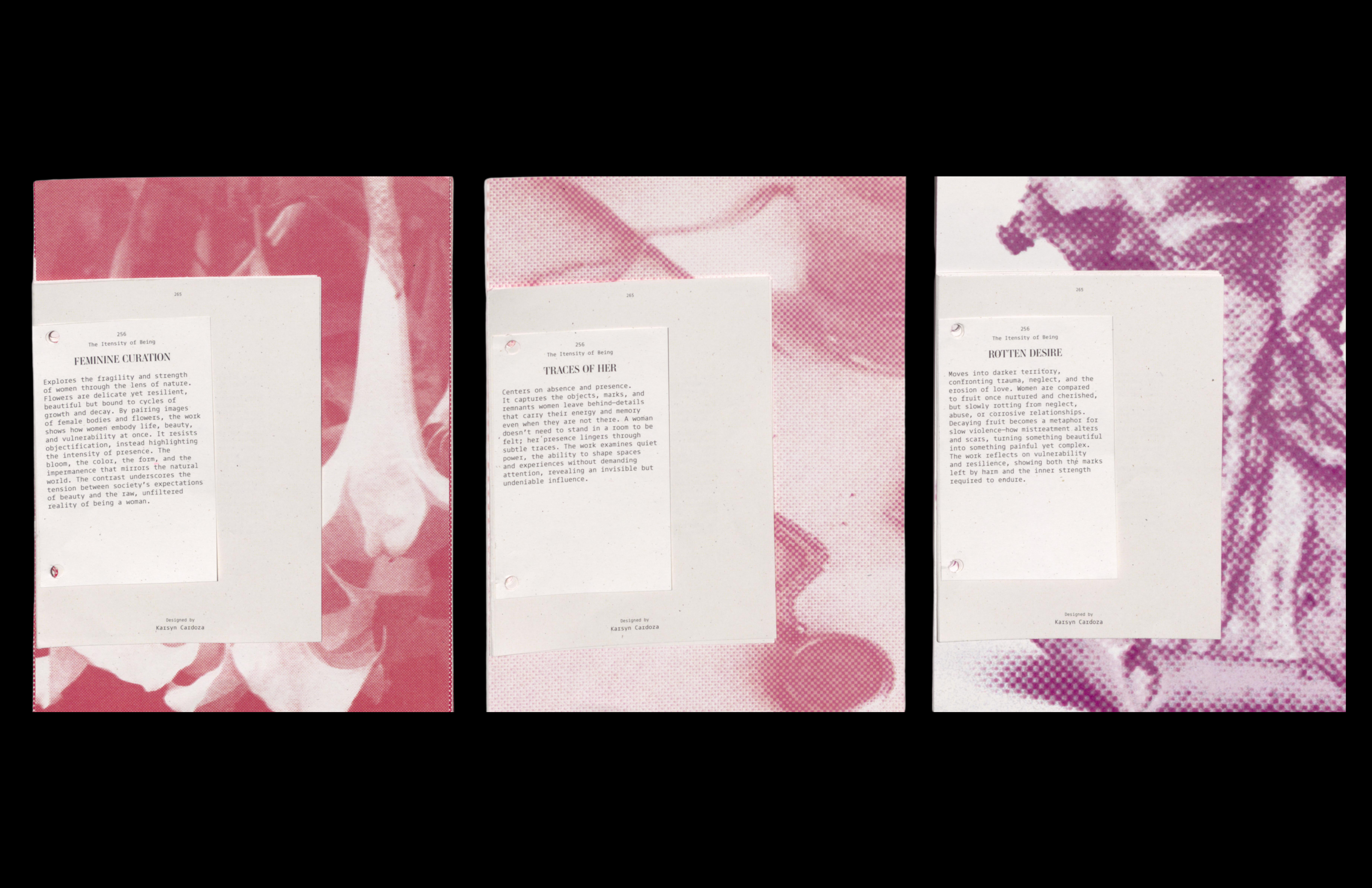 Feminine Curation examines beauty standards, comparing the feminine form to flowers. Traces of Her captures the lingering presence of feminine energy through objects, marks, or a lit space. Rotten Desire explores trauma, the dangers women face, and daily struggles, comparing the female form to decaying fruit to highlight the tension between beauty, vulnerability, and harsh realities.