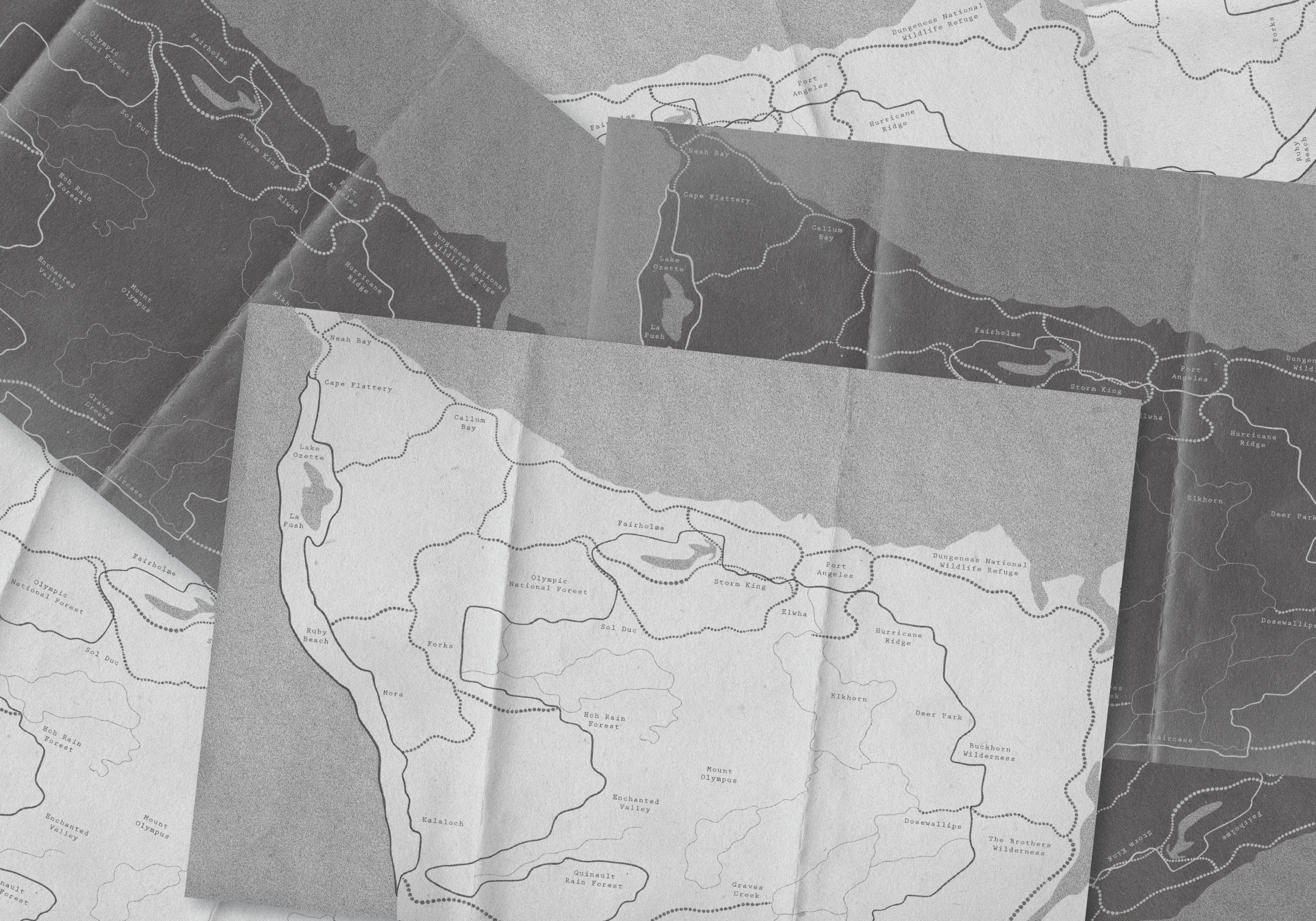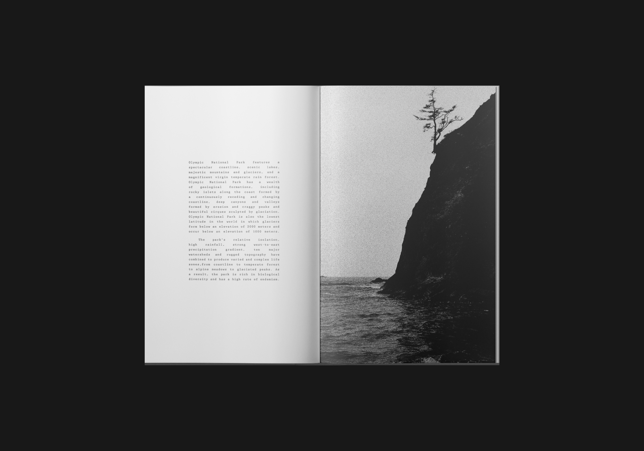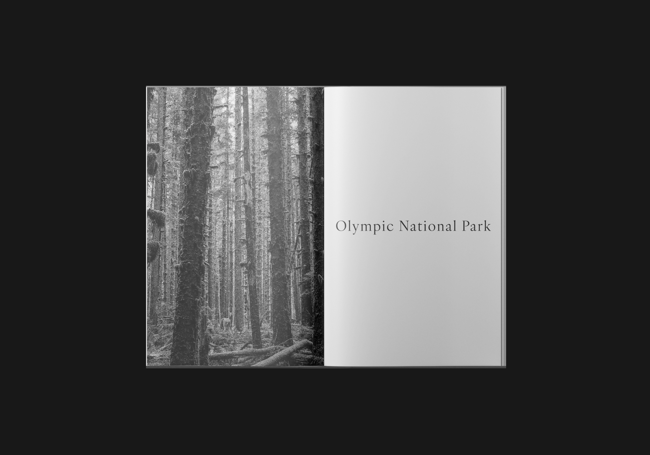 Olympic National Park is a promotional series celebrating the park's unique atmosphere. Inspired by its dreamlike quality—the white skies, heavy fog, and disorienting sense of scale—this series brings that feeling directly to the viewer. Using black-and-white risograph photography to amplify the park’s sense of mystery, and intentionally chaotic typography that mirrors quick-changing scenery, the project encourages visitors to unplug and experience the park for themselves.